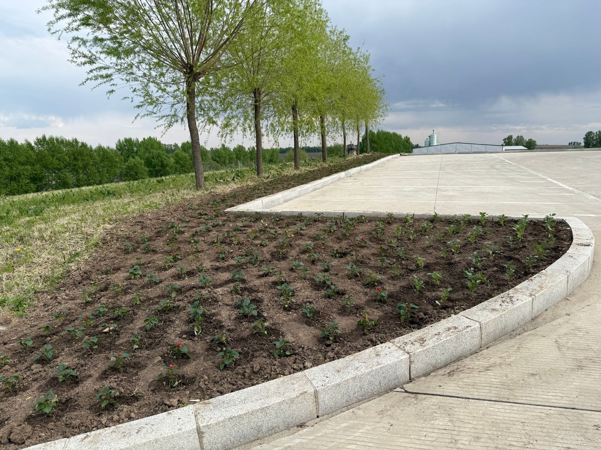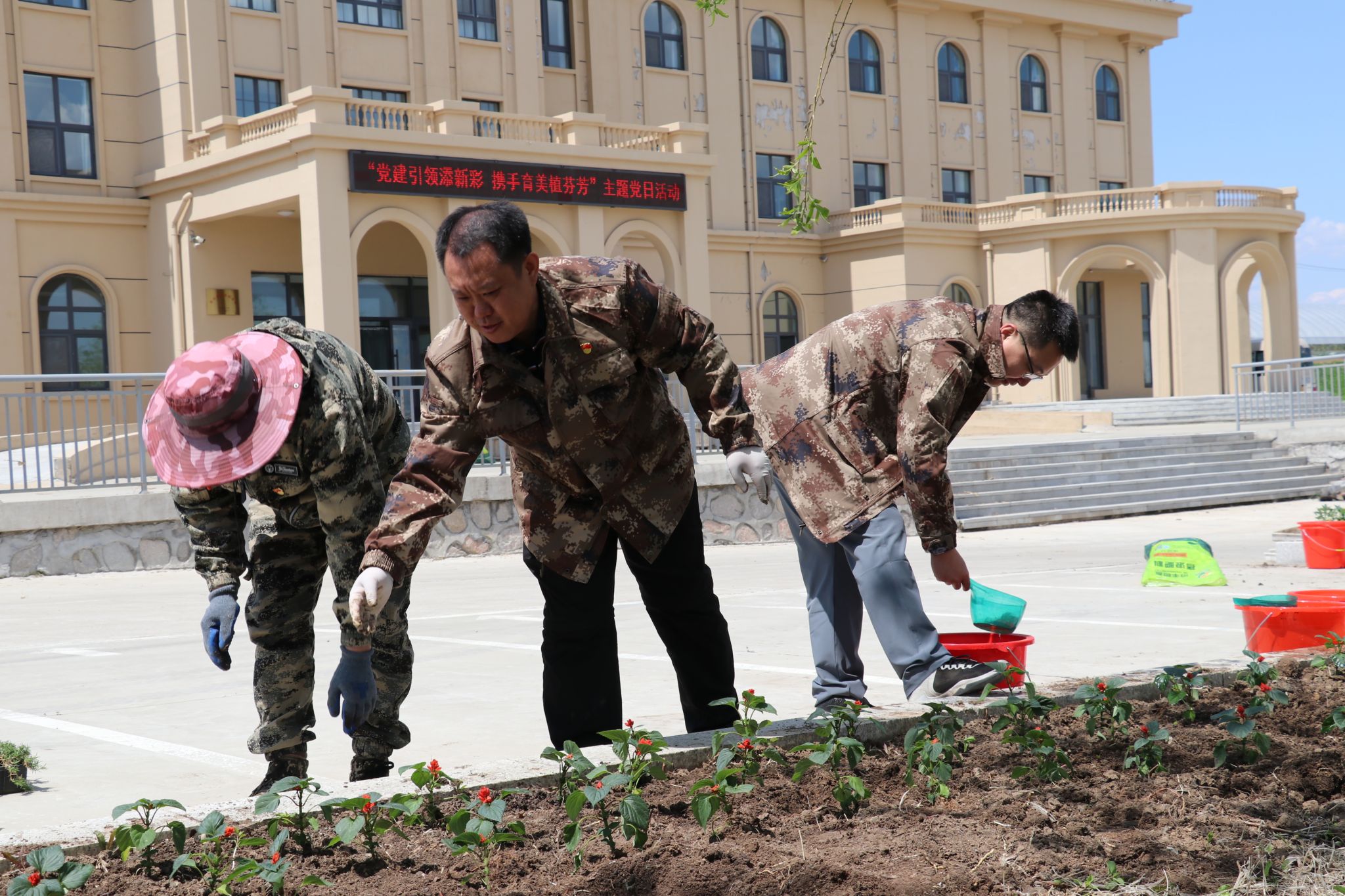 在实践教学综合楼前,全体党员列阵躬耕、干劲十足,经过分畦整地、铲土挖坑、扶苗定植、浇水灌溉等分工协作,栽种小丽花、知樱花、串红、四季海棠等花卉2000余株,为向阳基地增添绚丽色彩。